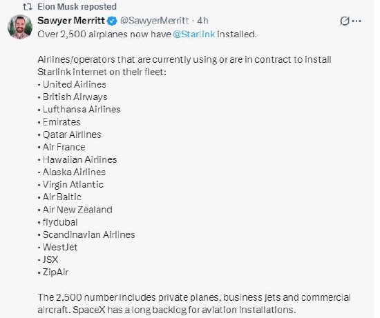 电动汽车分析师索耶·梅瑞特发帖称,目前全球已有超过2500架飞机安装了SpaceX的星链设备。马斯克转发了这条帖子。梅瑞特是在回复一位网友的询问,他写道:“目前已有超过 2500 架飞机安装了星链系统。
