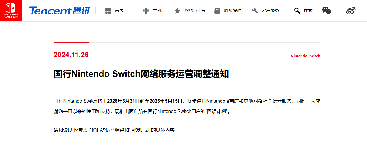 据了解,2024年11月,腾讯宣布国行Switch将于2026年3月31日起至2026年5月15日,逐步停止Nintendo e商店和其他网络相关运营服务。