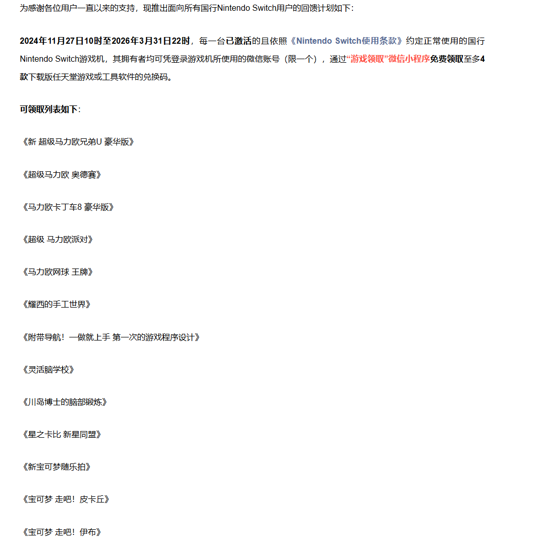 作为补偿,所有国行Switch用户可以从13款游戏任选4款免费领取,其中包括马里奥、宝可梦、星之卡比等多款任天堂第一方游戏,总价值预计超过1000元。
