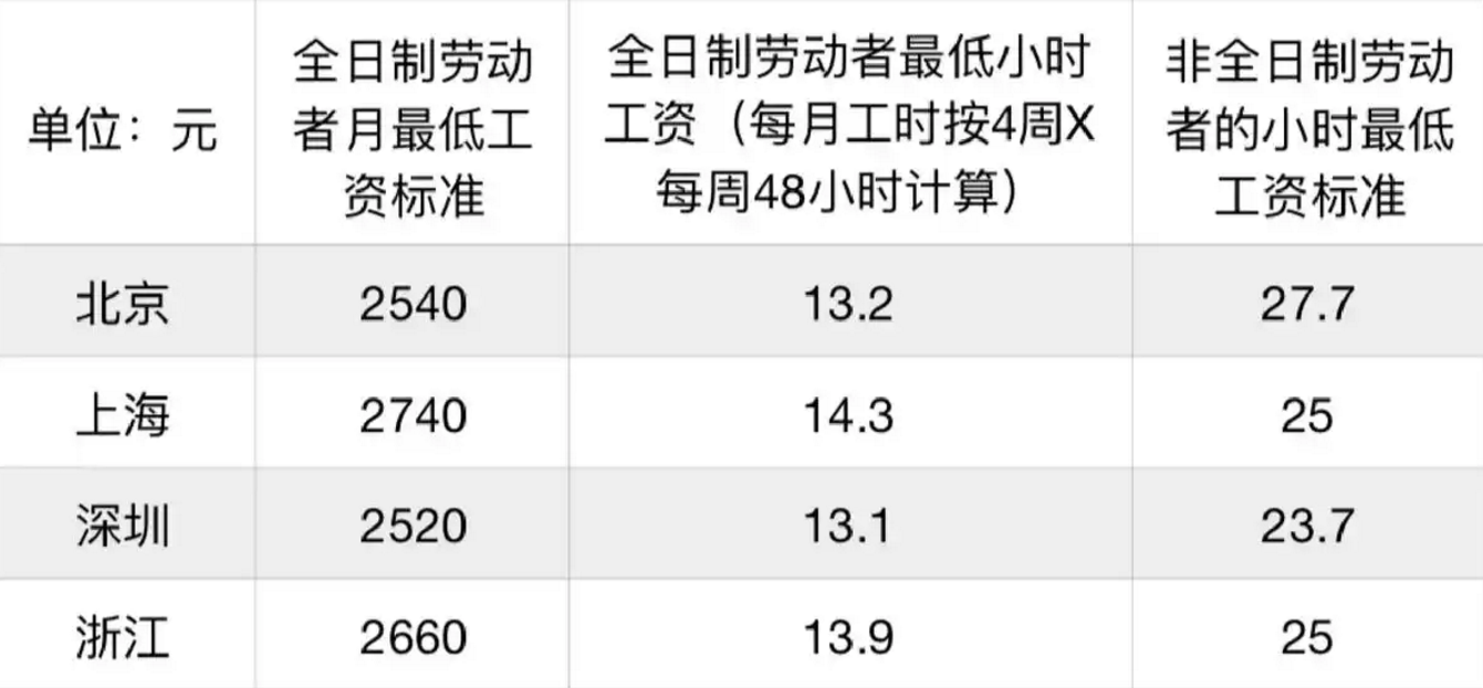 这位专家还表示,当前各地针对全日制劳动者的月最低工资标准多在2000元—3000元/月之间,若换算成最低小时工资(按每月工时4周、每周48小时计算),会明显低于针对非全日制劳动者设定的小时最低工资标准。