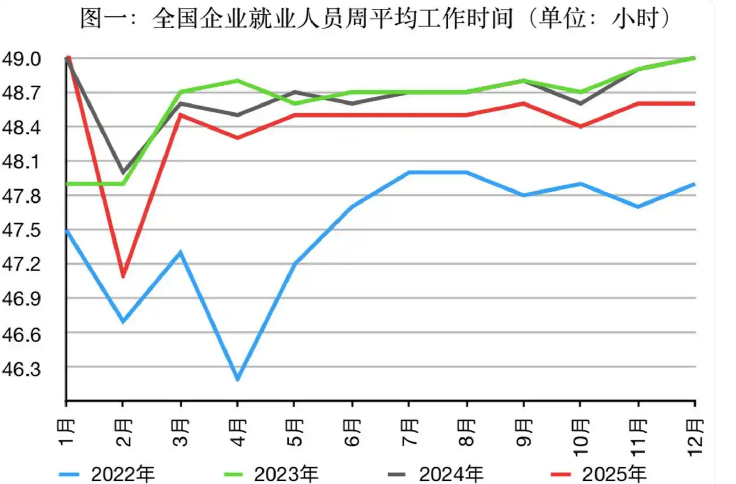 中国人民大学中国就业研究所所长曾湘泉接受采访时表示,2025年企业就业人员周平均工时下降,一方面可能是工时吸收经济压力的调节机制已接近极限——工时不可能不断上涨;另一方面,“反内卷”和劳动者权益保障力度持续加强,也带来了积极影响。