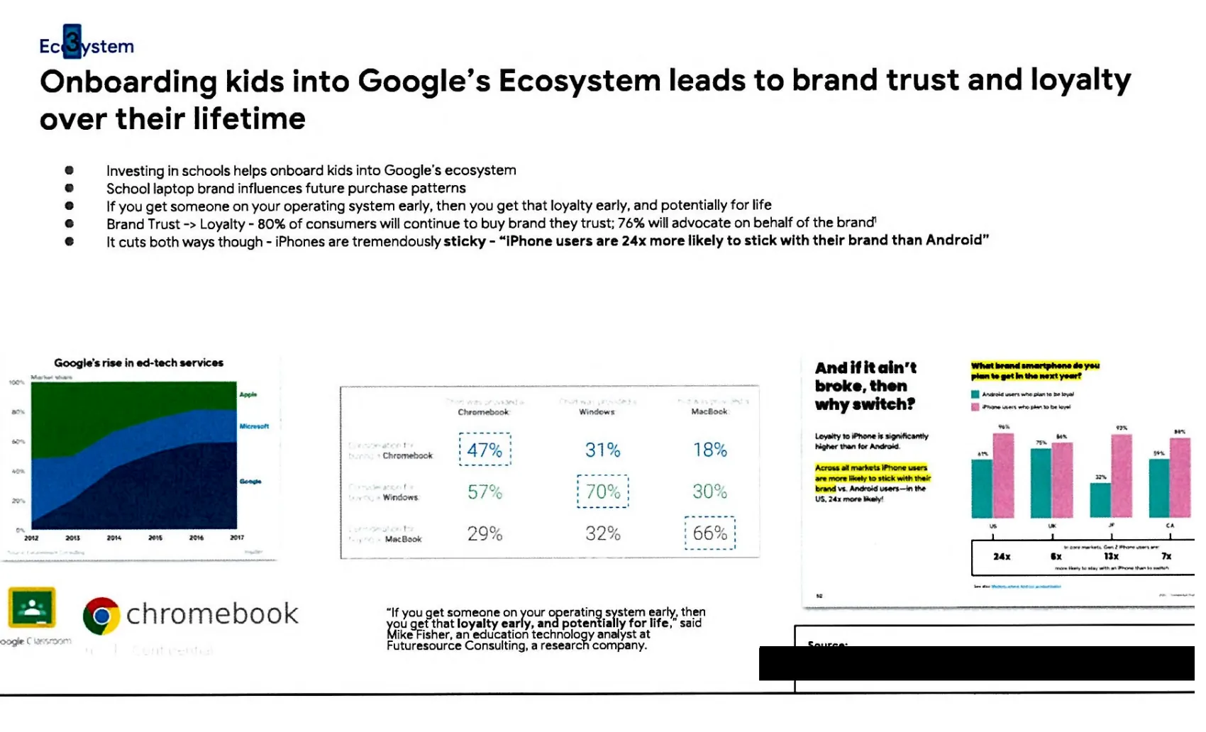 文件显示,Google在过去十多年间持续加码教育产品投资,同时将Chromebook打造成课堂标配设备,并在文稿中引用研究指出,学校使用的笔记本电脑品牌会“影响日后的购买模式”。 演示文稿的一页还特别引用了《纽约时报》2017年的一篇报道,将其中“Google正参与一场为了‘把学生钩住成为未来客户’的争夺战”这句话以粗体标出。 该引语在文件中被多次重复,并配以归纳性表述:“如果能让某人很早就使用你的操作系统,就能很早获得他的忠诚,而且可能是一辈子。”