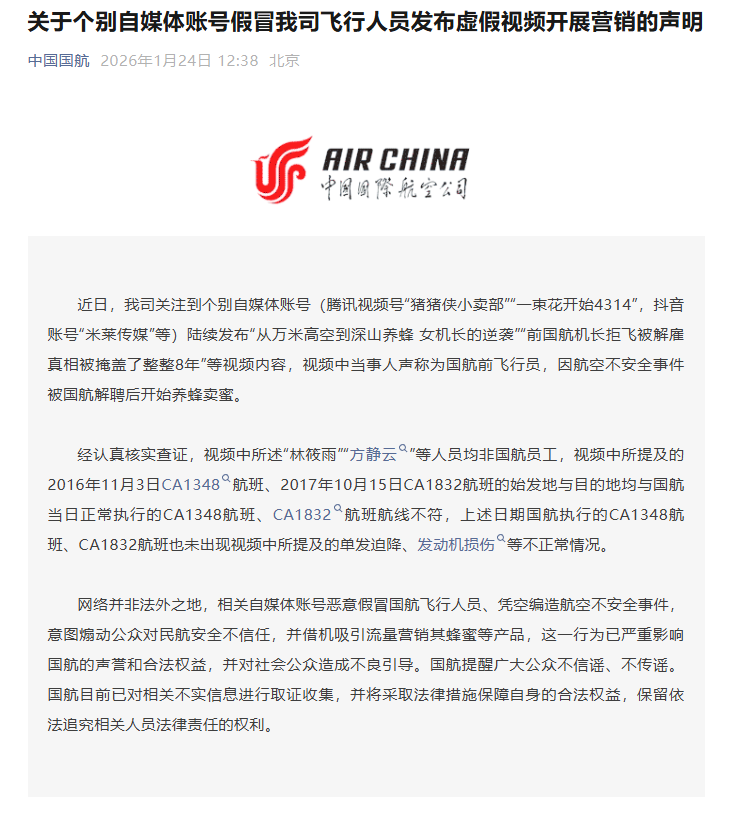 国航强调,相关自媒体账号恶意假冒国航飞行人员、凭空编造航空不安全事件,意图煽动公众对民航安全不信任,并借机吸引流量营销其蜂蜜等产品,这一行为已严重影响国航的声誉和合法权益,并对社会公众造成不良引导。
