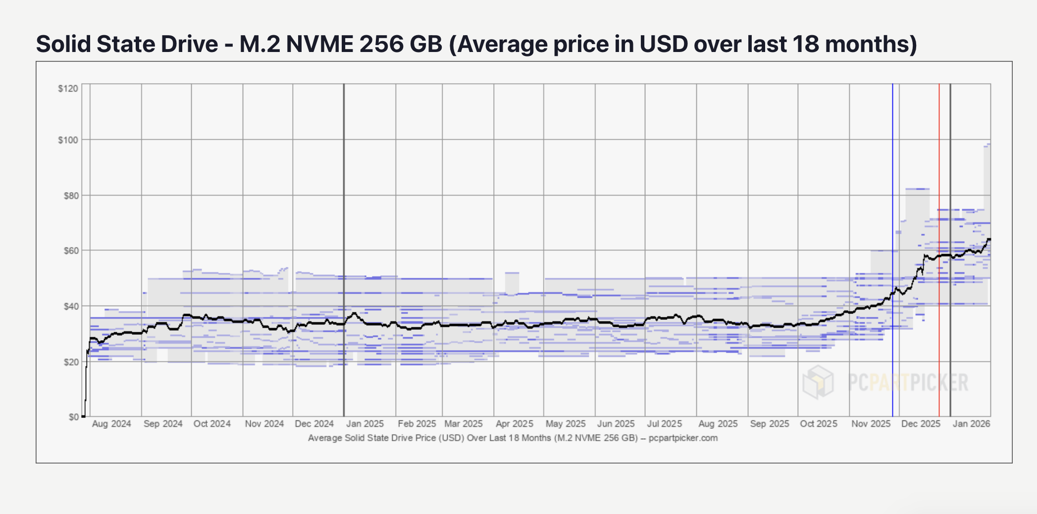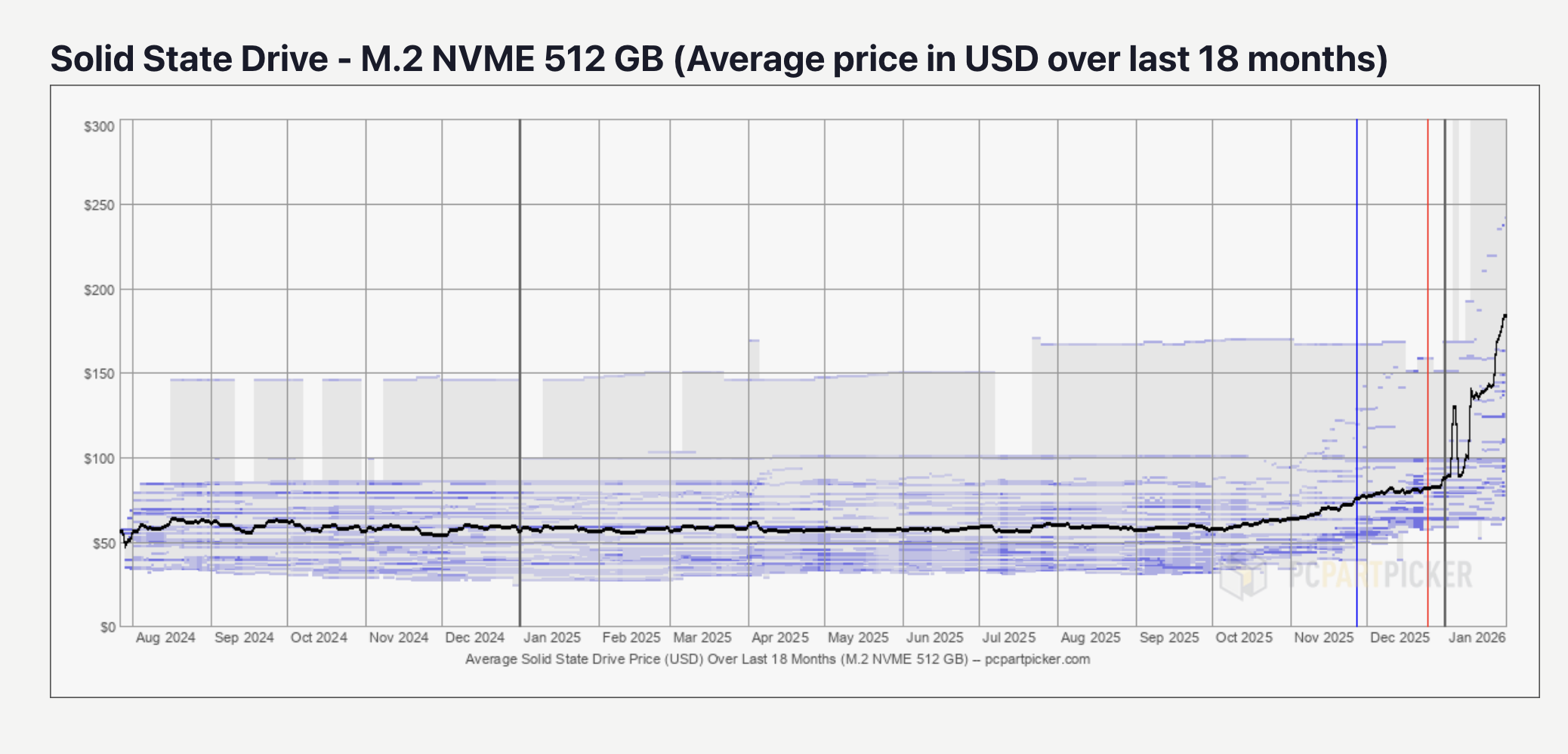 事实上,SSD的零售价格已经逐日攀升,PCPartPicker数据显示,自2025年10月以来,各类配置的SSD平均涨幅已达18%。