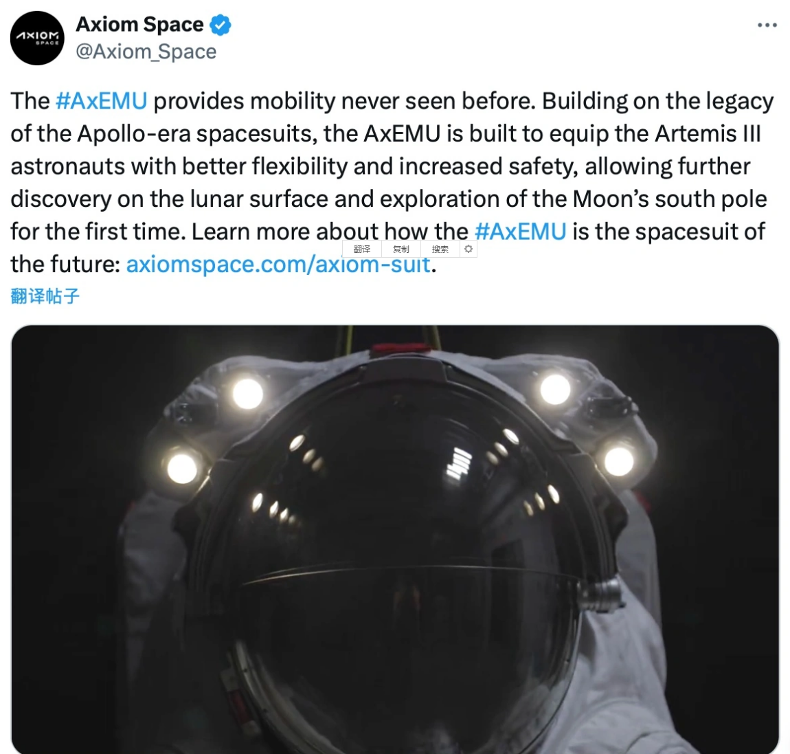 AxEMU的单次月面活动支持时间长达8小时,得益于新型背包生命维持系统,其在冷却、供气以及食物和水输送方面均进行了升级。