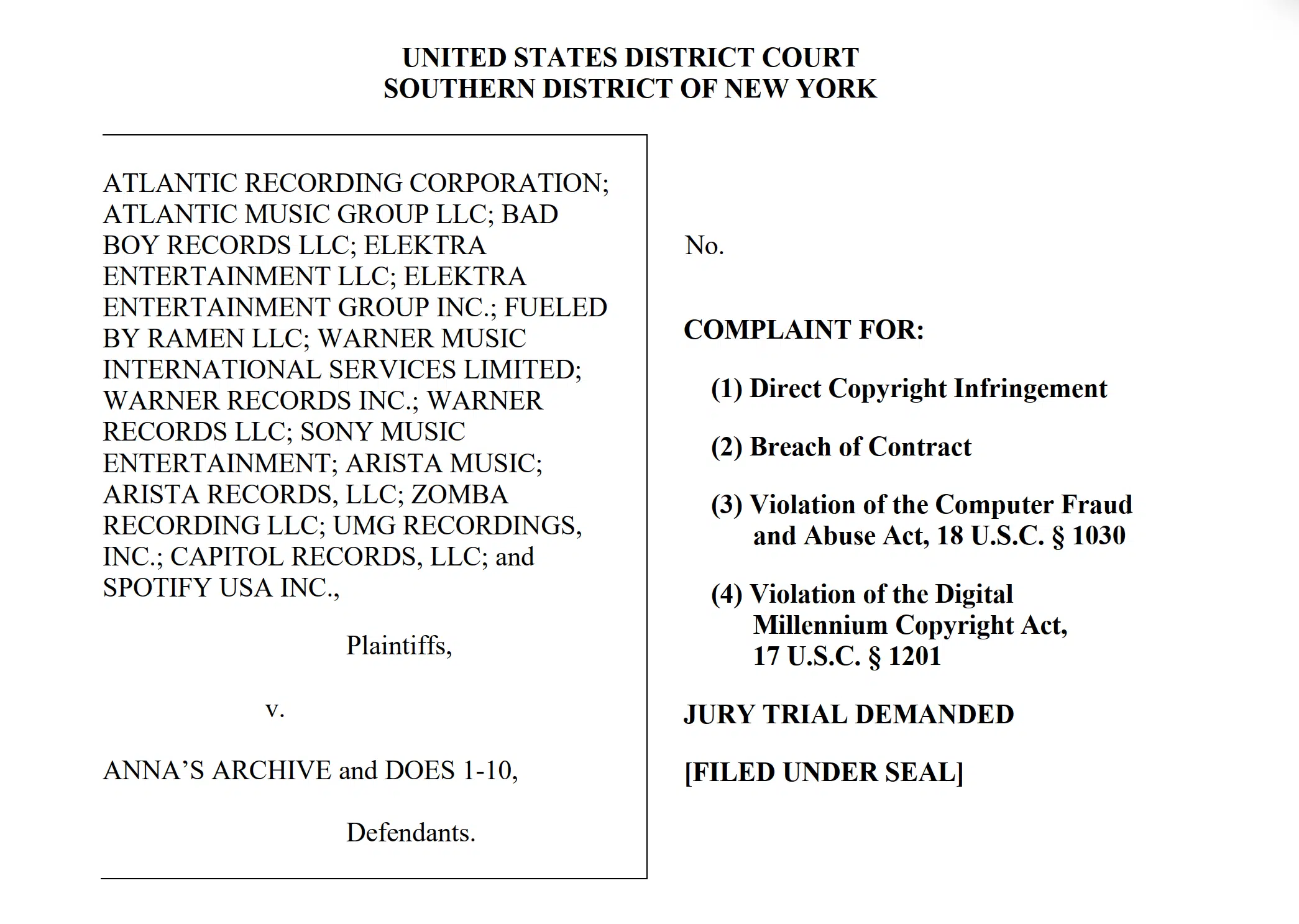 2025 年 12 月 29 日,Spotify 联同环球音乐(UMG)、索尼音乐、华纳音乐等唱片公司在美国纽约南区联邦法院提交诉状。 原告指控 Anna’s Archive 大规模侵犯版权、违反合同、违反《数字千年版权法案》(DMCA),并涉嫌违反《计算机欺诈和滥用法》(CFAA)。 诉状称该网站“公然”绕过 Spotify 的数字版权保护(DRM),从 Spotify 抓取了 8600 万个音乐文件以及涵盖 2.56 亿首曲目的元数据,最终目标是将这些数据面向公众“批量释放”。 原告诉称,一旦这些未经授权的录音作品被大规模免费传播,将对音乐产业造成“不可弥补的损害”。