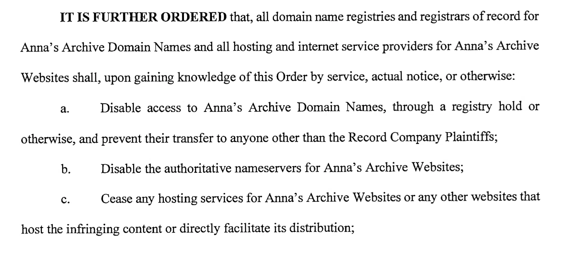 鉴于无法指望被告主动遵守,法院的禁令进一步延伸至大量第三方中介服务机构,包括域名注册局和注册商、主机服务公司以及其他网络服务提供者。 这些公司被要求采取合理措施,协助制止 Anna’s Archive 上的侵权活动。 为免产生歧义,禁令中点名列出多个机构,包括 Public Interest Registry、Cloudflare、Switch Foundation、瑞典互联网基金会、印度国家互联网交换中心、Njalla、IQWeb FZ-LLC、Immaterialism Ltd.、Hosting Concepts B.V. 以及 Tucows Domains Inc. 等。 Cloudflare 的出现格外引人注目,因为其主要提供的是反向代理与加速服务,并不长期存储 Anna’s Archive 的内容,但法院仍认为其与网站运作之间关联紧密到足以成为禁令的对象。