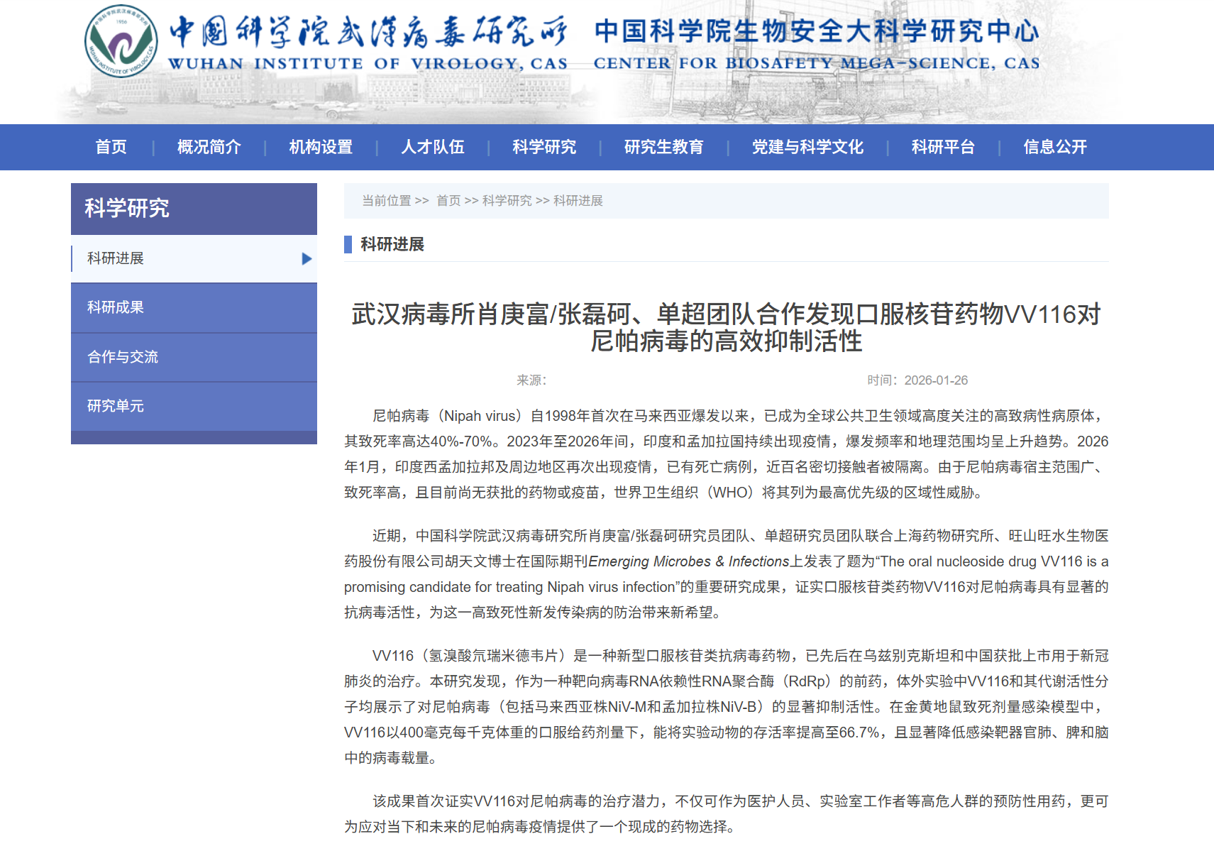 据中国科学院武汉病毒研究消息,近期,中国科学院武汉病毒研究所肖庚富/张磊砢研究员团队、单超研究员团队联合上海药物研究所、旺山旺水生物医药股份有限公司胡天文博士在国际期刊Emerging Microbes & Infections上发表了题为“The oral nucleoside drug VV116 is a promising candidate for treating Nipah virus infection”的重要研究成果,证实口服核苷类药物VV116对尼帕病毒具有显著的抗病毒活性,为这一高致死性新发传染病的防治带来新希望。