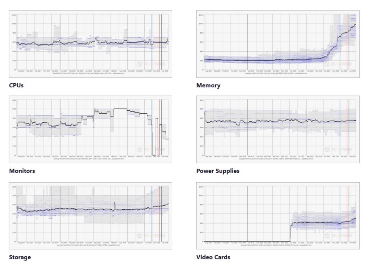 数据显示,在过去18个月内,处理器和电源供应器的价格相对稳定,显示器价格甚至略有下跌,但内存和存储设备的价格却出现了显著变化。