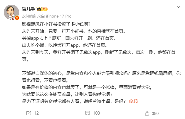 今日,知名网红博主“留几手”发文吐槽影视飓风霸屏小红书。他表示,从昨天开始,只要一打开小红书,影视飓风Tim的直播就在首页。关掉App去上个厕所,回来打开一刷还在首页;出去吃个晚饭打开App,他还在首页。