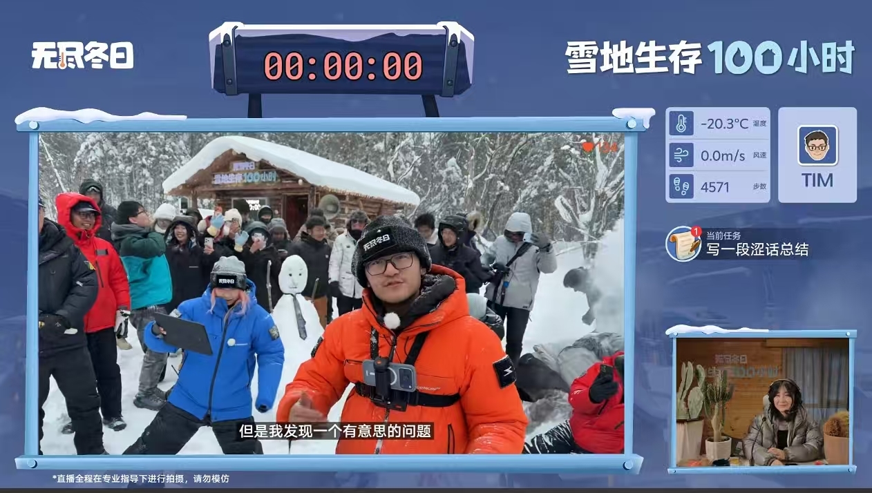 1月23日11时起,Tim开启新的直播挑战,在东北零下30°的雪地里生存100小时,引发数万人在线围观。