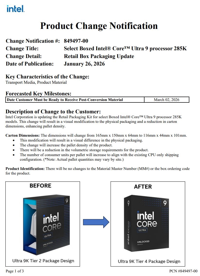 近日,Intel发布了一份产品变更通知(PCN),确认其旗舰台式机处理器酷睿Ultra 9 285K将迎来零售包装的更新,原有的“Ultra 9K Tier 2”大尺寸包装将被更为紧凑的“Ultra 9K Tier 4”方案取代。