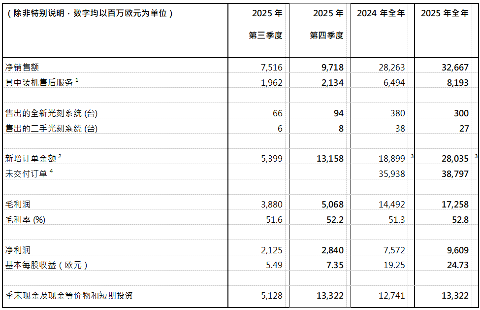 今天,光刻机巨头ASML发布了2025年第四季度及全年财报。数据显示,在2025年第四季度,ASML的净销售额为97亿欧元,毛利率为52.2%,净利润达28亿欧元。整个2025年,ASML 的净销售额为327亿欧元,较2024年增长16%,净利润为96亿欧元。