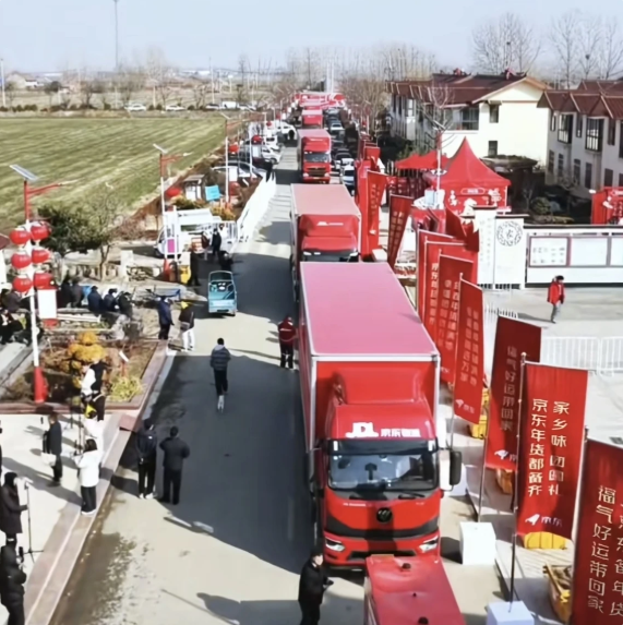 随着京东长达百米的红色车队抵达光明村,大量年货也即将送到村民们手上。