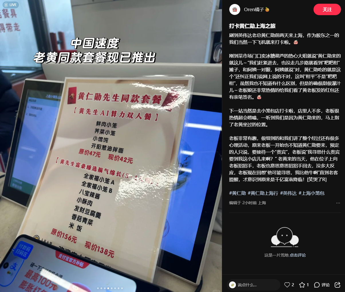 据悉,黄仁勋还在乳山路的上品小笼用餐,店主表示:“黄总非常随和,亲自找的位置并和店长拍照留念,还发了新年红包。”