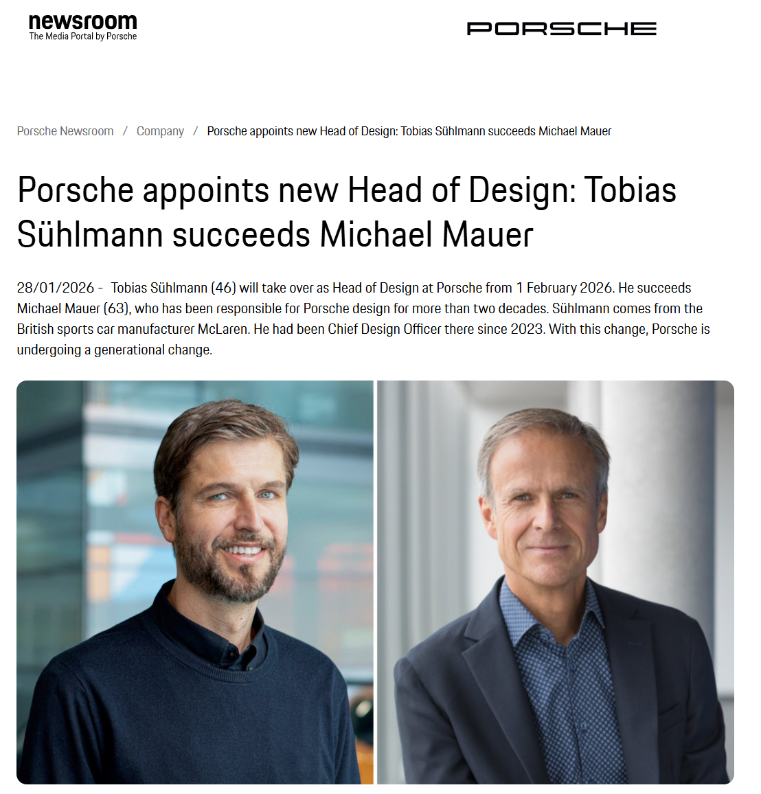 保时捷官方日前宣布,前迈凯伦首席设计官托比亚斯·叙尔曼将于2026年2月1日接替米夏埃尔·莫尔,出任品牌设计负责人,该任命即刻生效。据了解,叙尔曼毕业于普福尔茨海姆应用科学大学,2005 年于大众集团开启职业生涯,后转战布加迪,又以外观设计负责人的身份加盟阿斯顿·马丁。