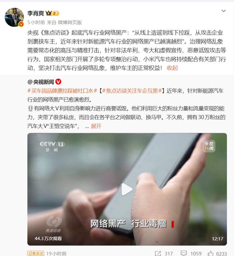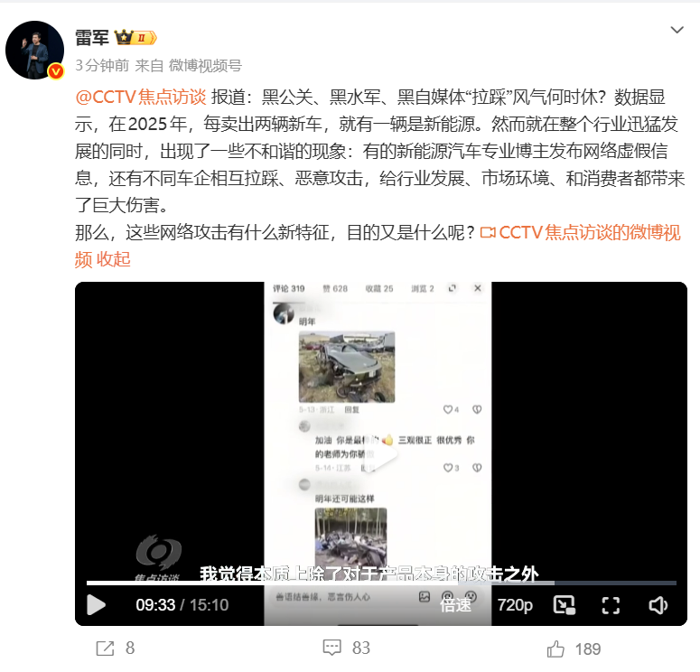 今日央视《焦点访谈》起底汽车行业网络黑产:“从线上造谣到线下拉踩,从攻击企业到裹挟车主,近年来针对新能源汽车行业的网络黑产已越演越烈”。雷军也在个人微博上进行了转发:“黑公关、黑水军、黑自媒体“拉踩”风气何时休?”