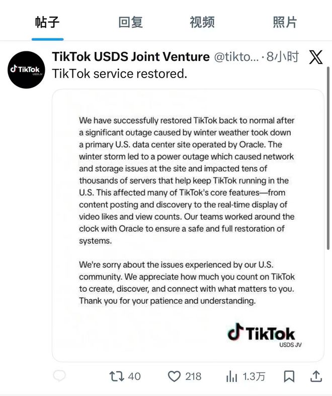 当地时间2月1日,TikTok美国数据安全合资有限责任公司(简称TikTok USDS合资公司)在X平台上发帖表示,在上周在因冬季天气导致主要由甲骨文(ORCL.US)运营的美国数据中心瘫痪而引发的重大服务中断故障之后,TikTok已于周日恢复正常运行。
