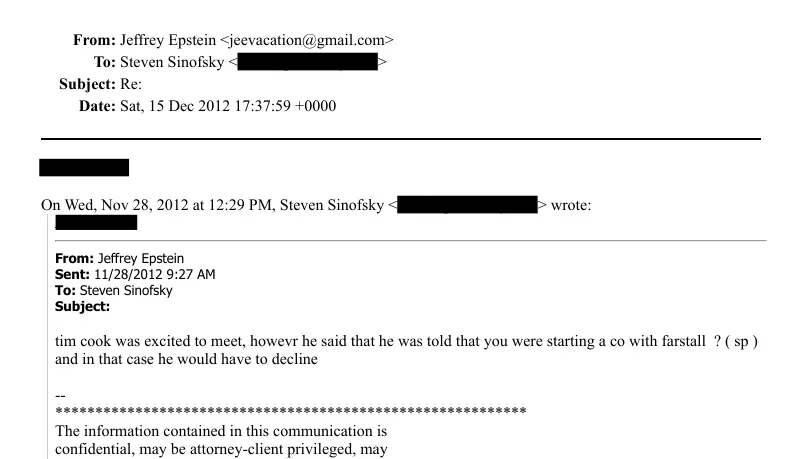 根据档案中一封日期为 2012 年 11 月下旬的邮件,在西诺夫斯基离职消息公开数周后,爱泼斯坦写信告诉他,苹果 CEO Tim Cook(Tim Cook)“对见面感到兴奋”。 不过,爱泼斯坦随即提到一个“障碍”:据库克所闻,西诺夫斯基正计划与“farstall”一起创办公司,若属实,库克将不得不婉拒见面请求。 从时间线和上下文判断,这里的“farstall”被普遍认为是拼写错误,实际指向的是当时刚被苹果宣布即将离职的前 iOS 主管斯科特·福斯特尔(Scott Forstall)。