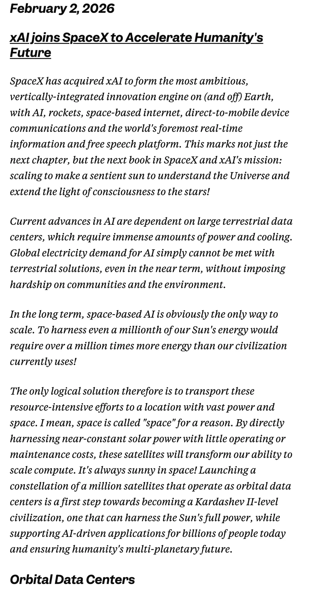 SpaceX已完成对xAI的收购,通过整合AI、火箭技术、天基互联网、直连移动设备通信,以及全球领先的实时信息与自由言论平台,打造地球(及地球之外)上最具雄心、垂直整合程度最高的创新引擎。这不仅是SpaceX与xAI使命的新篇章,更是全新的征程:我们将拓展规模,创造一个能感知的“太阳”来理解宇宙,并将意识之光延伸至星辰!