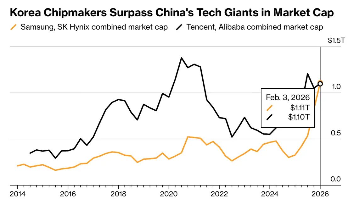 2月3日,据彭博社报道,韩国两家最具价值公司的总市值在周二首次超越了两家中国科技巨头,凸显出全球AI热潮的演变正在重塑亚洲科技领域的投资格局。在周二的股市交易中,三星电子和SK海力士的总市值达到1.11万亿美元,略微超过了阿里巴巴集团和腾讯的1.10万亿美元。阿里和腾讯是在中国香港上市的两家大型内地科技公司。