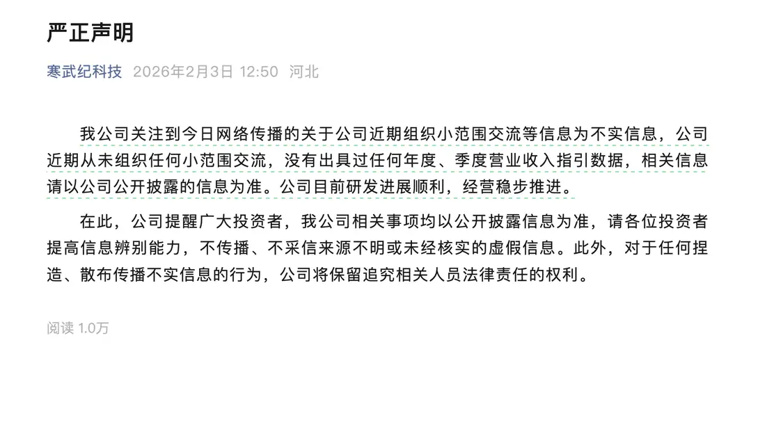 2月3日,寒武纪发布声明称,公司关注到今日网络传播的关于公司近期组织小范围交流等信息为不实信息,公司近期从未组织任何小范围交流,没有出具过任何年度、季度营业收入指引数据,相关信息请以公司公开披露的信息为准。公司目前研发进展顺利,经营稳步推进。
