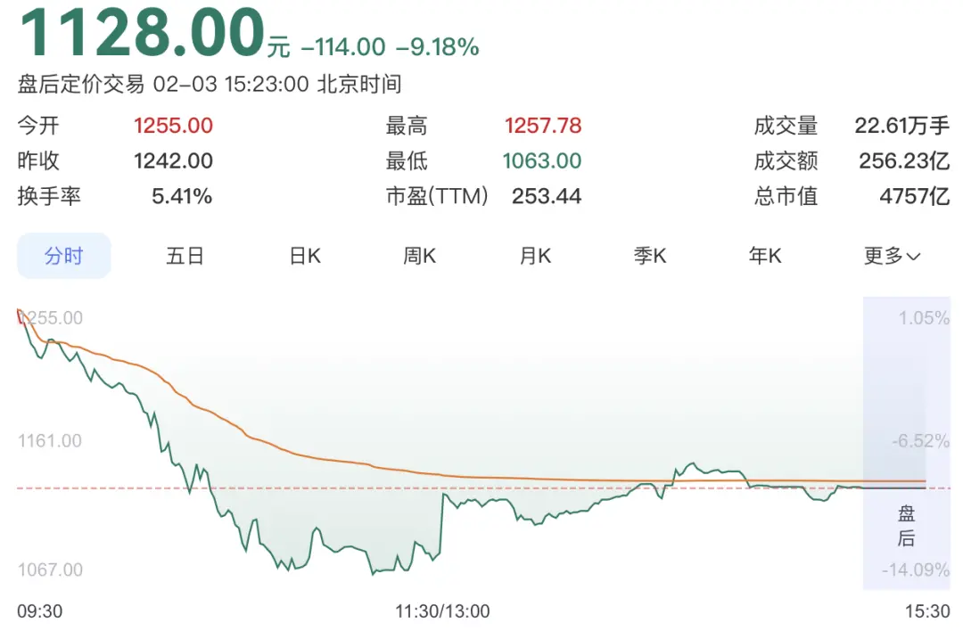 2026年2月3日,寒武纪股价开盘后迅速走低,市场突然变得不安。上午交易时段,股价接连失守1200元和1100元整数关口。