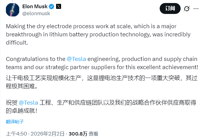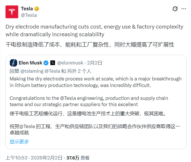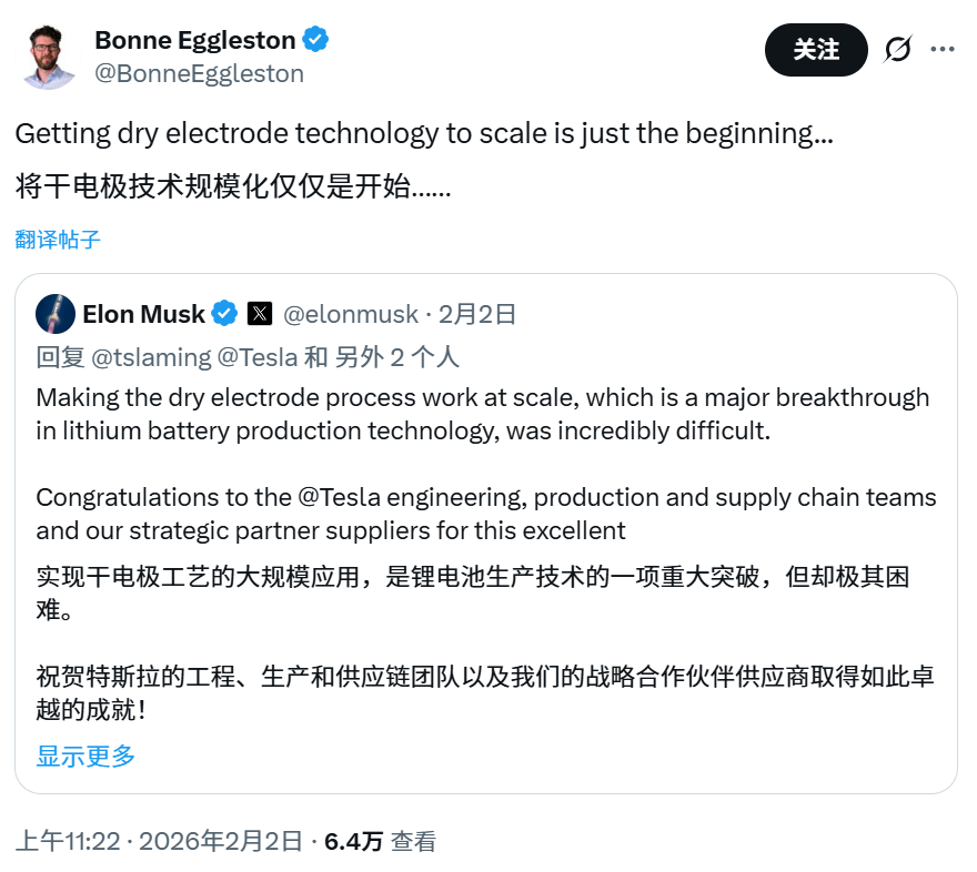 干电极工艺的规模化极其困难。这是特斯拉工程、生产、供应链团队及合作伙伴的重要成就。