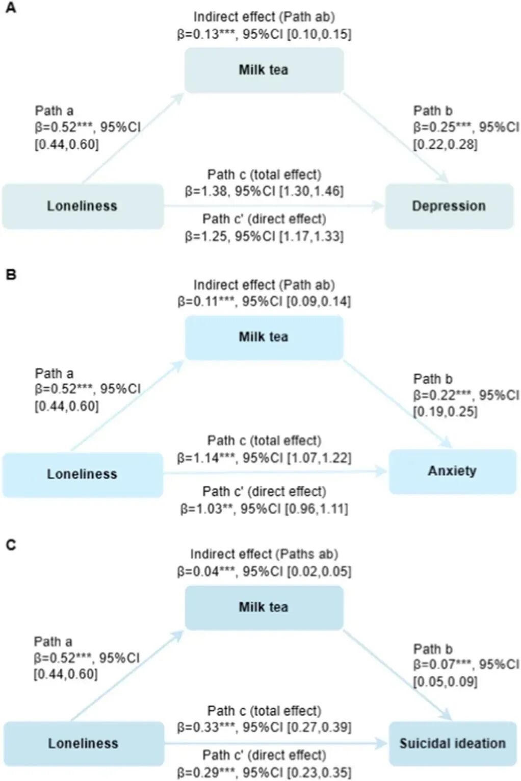 结果显示,孤独感与奶茶成瘾有显著正相关,而奶茶成瘾又与抑郁、焦虑和自杀观念有显著正相关,这表明奶茶成瘾在孤独感与不良心理健康状况之间起到了中介作用。它揭示了,奶茶成瘾不仅是孤独感与不良心理健康状况之间关系的一个显著指标,而且实际上还扮演了一个中介角色。