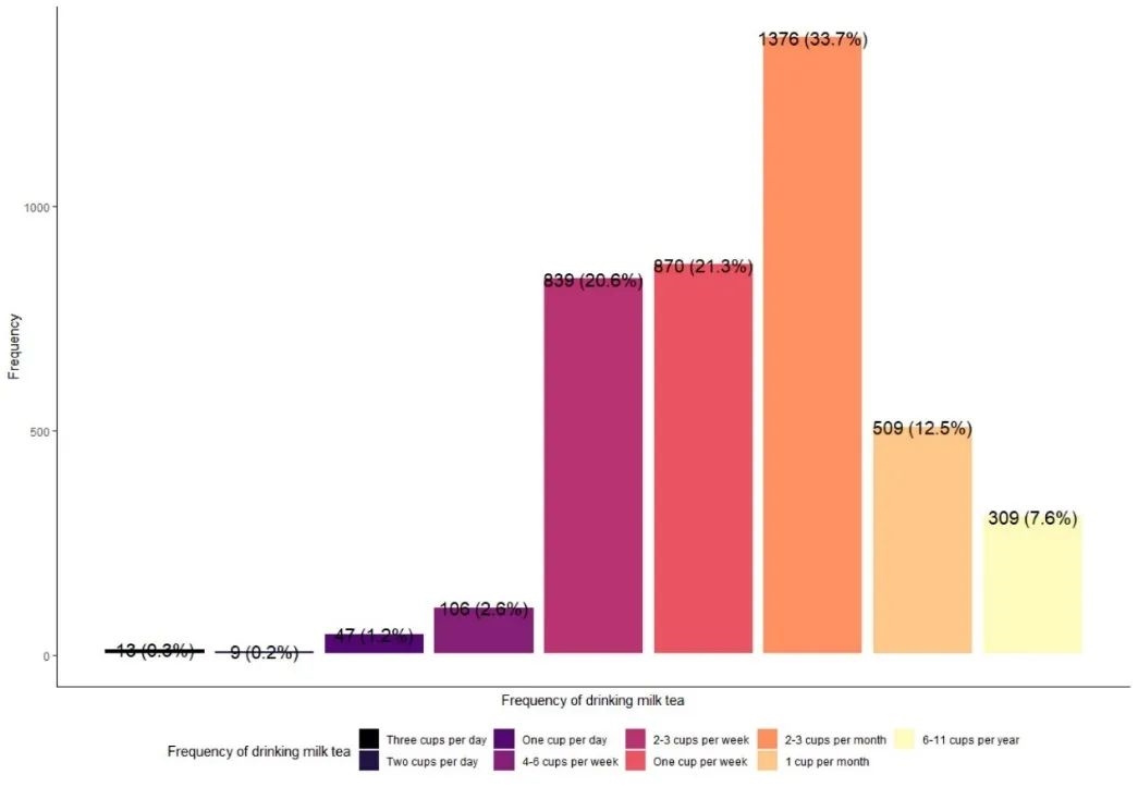 几乎一半的受访者表示,他们每周至少喝一杯奶茶。其中,2.6% 的青少年每周喝 4 至 6 杯奶茶,20.6% 的青少年每周喝 2 至 3 杯奶茶。这一发现为所有人敲响了警钟,因为奶茶不仅在中国,而且在全世界都备受欢迎。