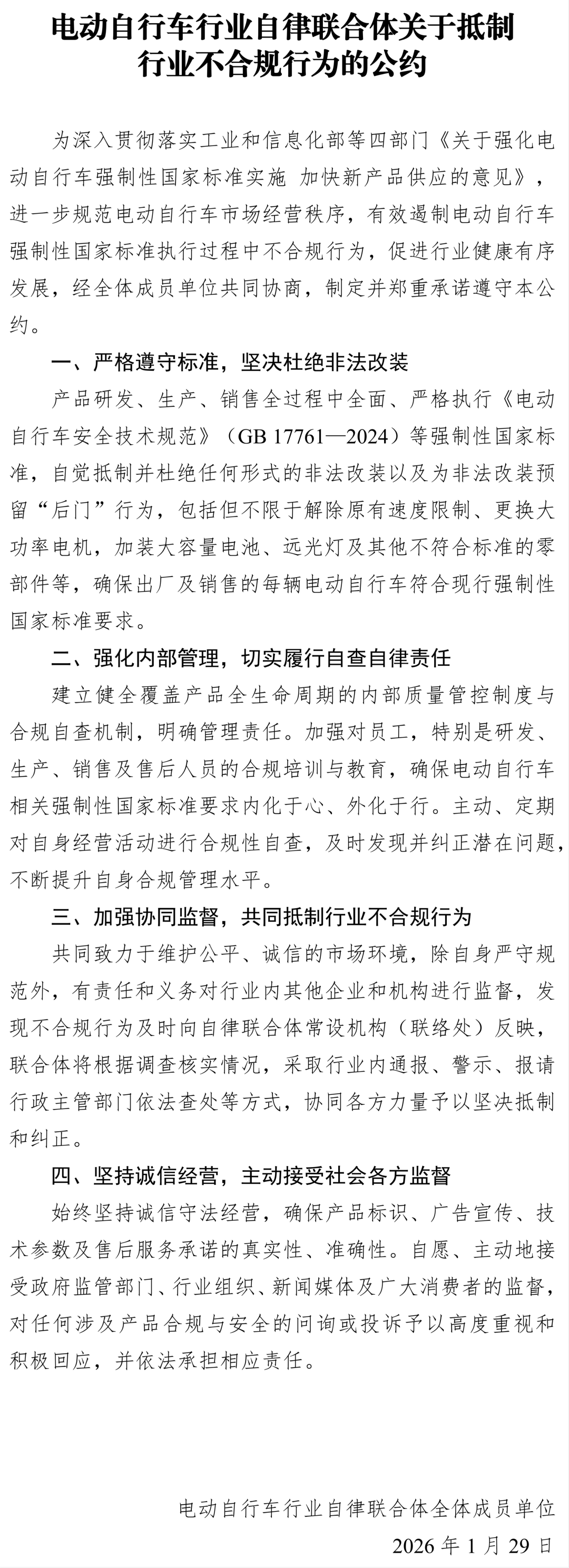 电动自行车行业自律联合体全体成员单位共同签署了公约,正式向行业不合规行为宣战。公约的核心直指长期以来的行业顽疾:非法改装。参与企业郑重承诺,在产品研发、生产和销售的全过程中,将全面、严格执行强制性国家标准GB 17761—2024。