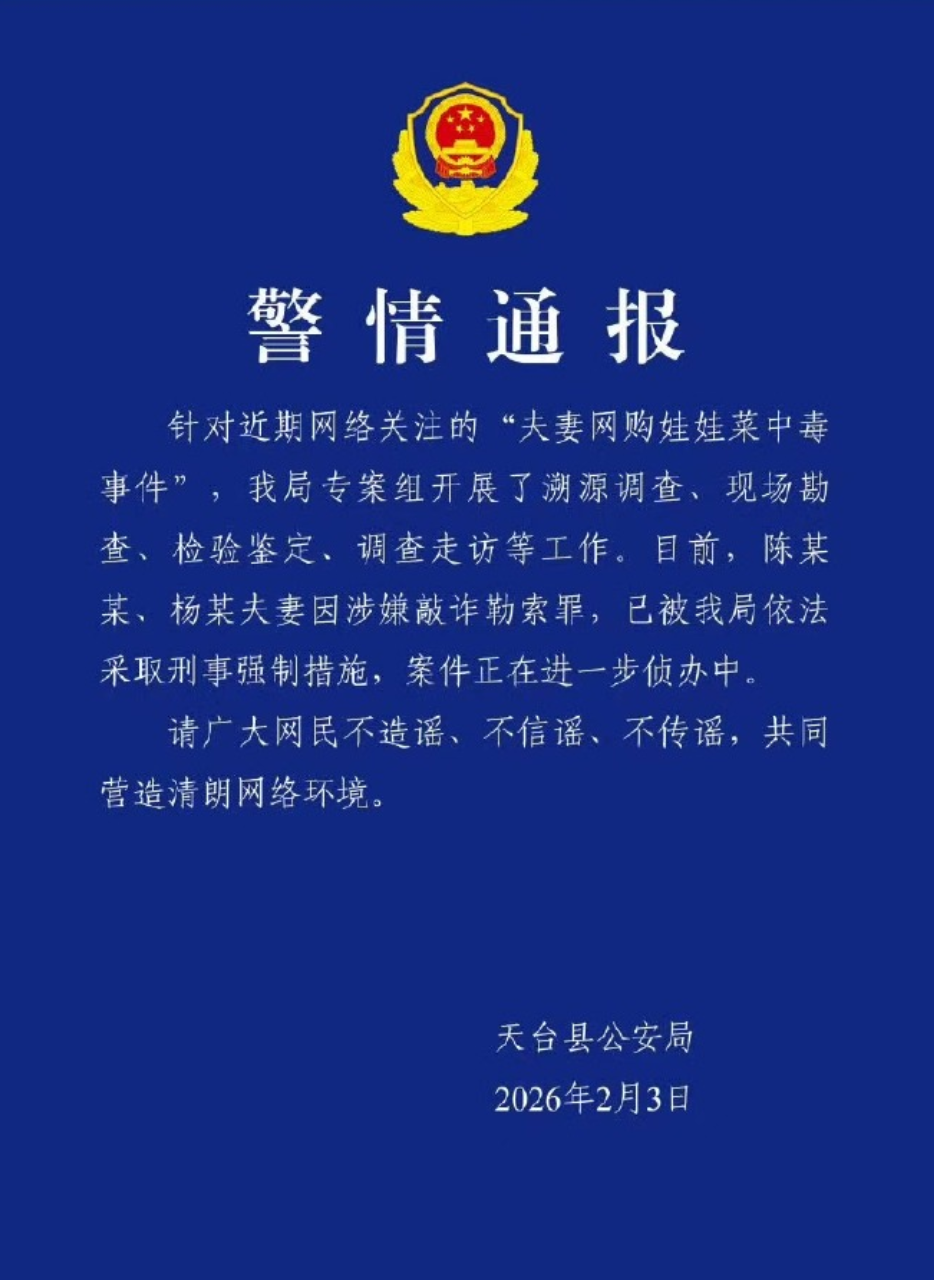 吃娃娃菜中毒夫妻均被刑拘 官方通报:涉嫌敲诈勒索