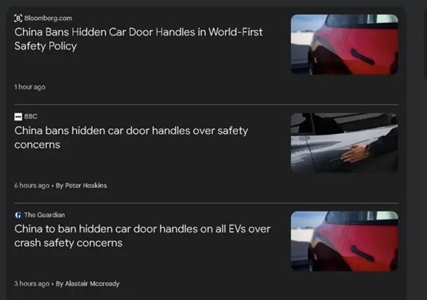 彭博社称:“中国已经禁止电动汽车配备(全)隐藏式车门把手,成为全球首个以立法形式禁用该设计的国家,相关规定将于明年1月1日起实施。”