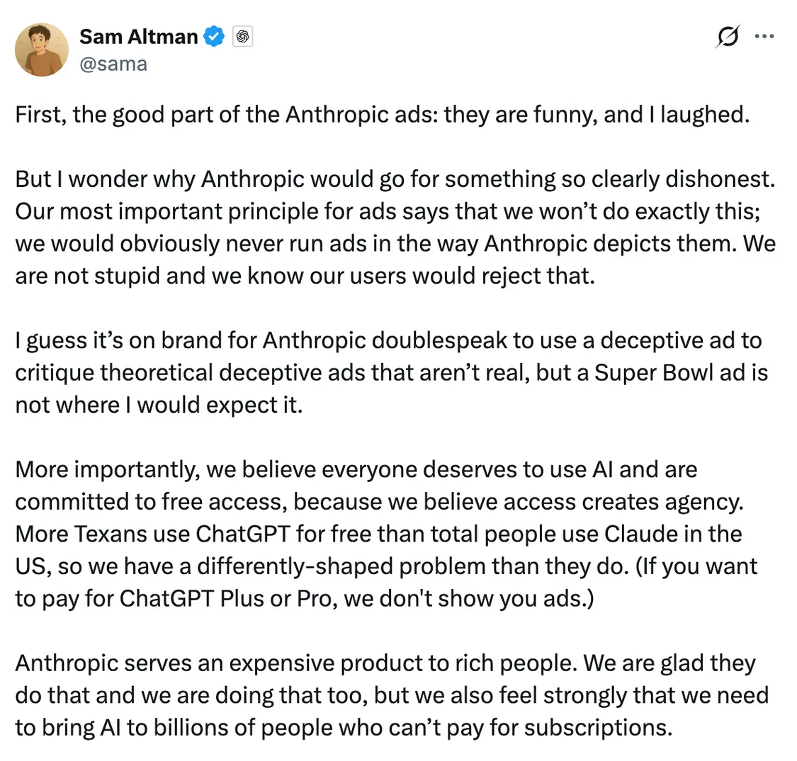 奥特曼周三在X发表长文,回应了Anthropic的嘲讽。“首先,说说Anthropic广告的优点:它很有趣,我笑了。但我不理解Anthropic为何要采用如此明显不诚实的手法。我们关于广告最重要的原则明确禁止这类做法。我们显然永远不会以Anthropic描绘的方式投放广告。我们并不愚蠢,也知道用户会拒绝那种方式。”奥特曼称。