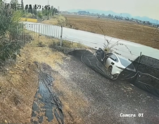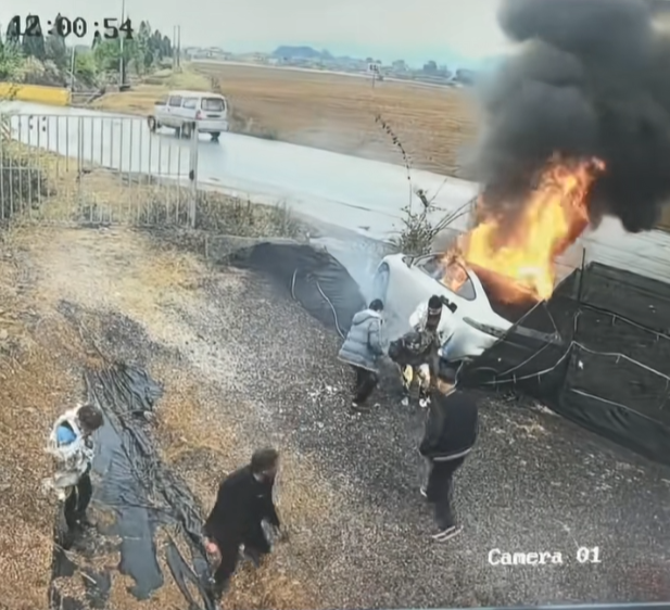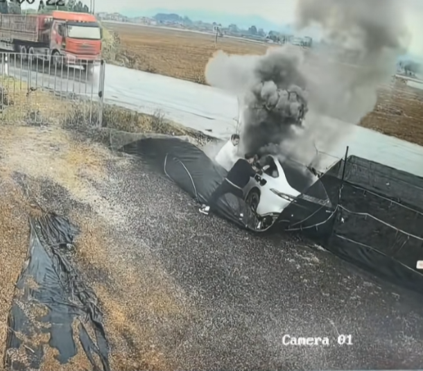 电动车侧滑进沟不到1分钟烧穿乘员舱 路人砸窗连救出3人