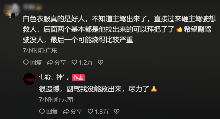 据视频发布者,也是参与救援的司机透露,“很遗憾,副驾我没能揪出来,尽力了”。