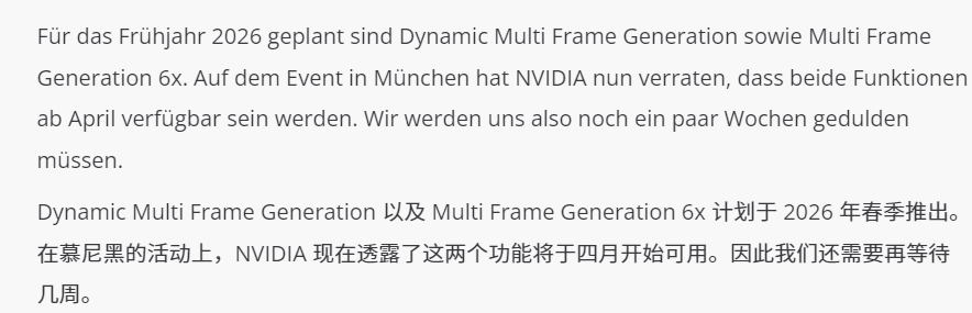 据HardwareLuxx最新透露,其在访问NVIDIA慕尼黑分部时获悉,DLSS 4.5技术中的两大核心特性,6倍多帧生成与动态多帧生成将于2026年4月上线。NVIDIA的动态多帧生成与传统固定倍数方案不同,该技术由驱动程序根据场景负载智能调节帧生成倍数,以匹配用户设定的目标刷新率。