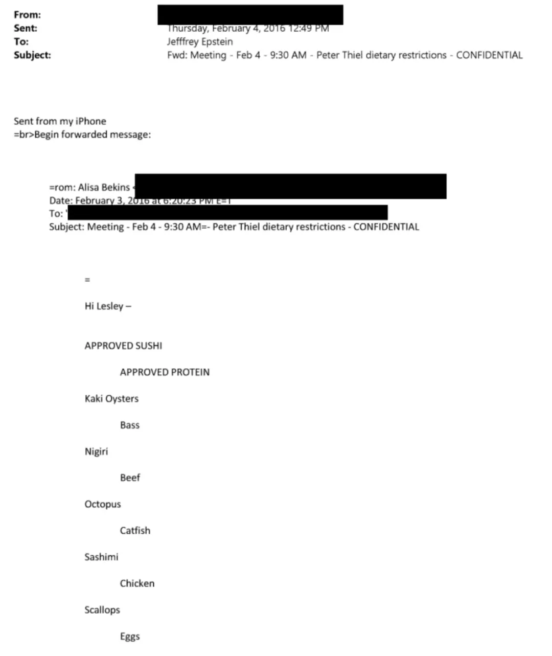 有趣的是,Thiel的助手曾向爱泼斯坦发送了一份详尽的“饮食禁忌单”,要求避开乳制品和麸质。