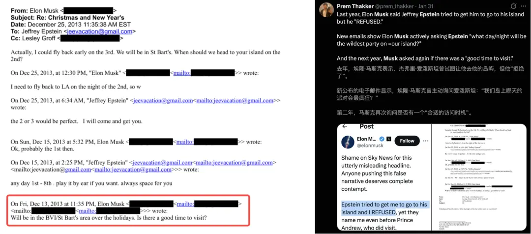 尽管马斯克坚称从未登岛,但邮件显示他在2012年曾询问爱泼斯坦“岛上的派对哪晚最疯狂”。