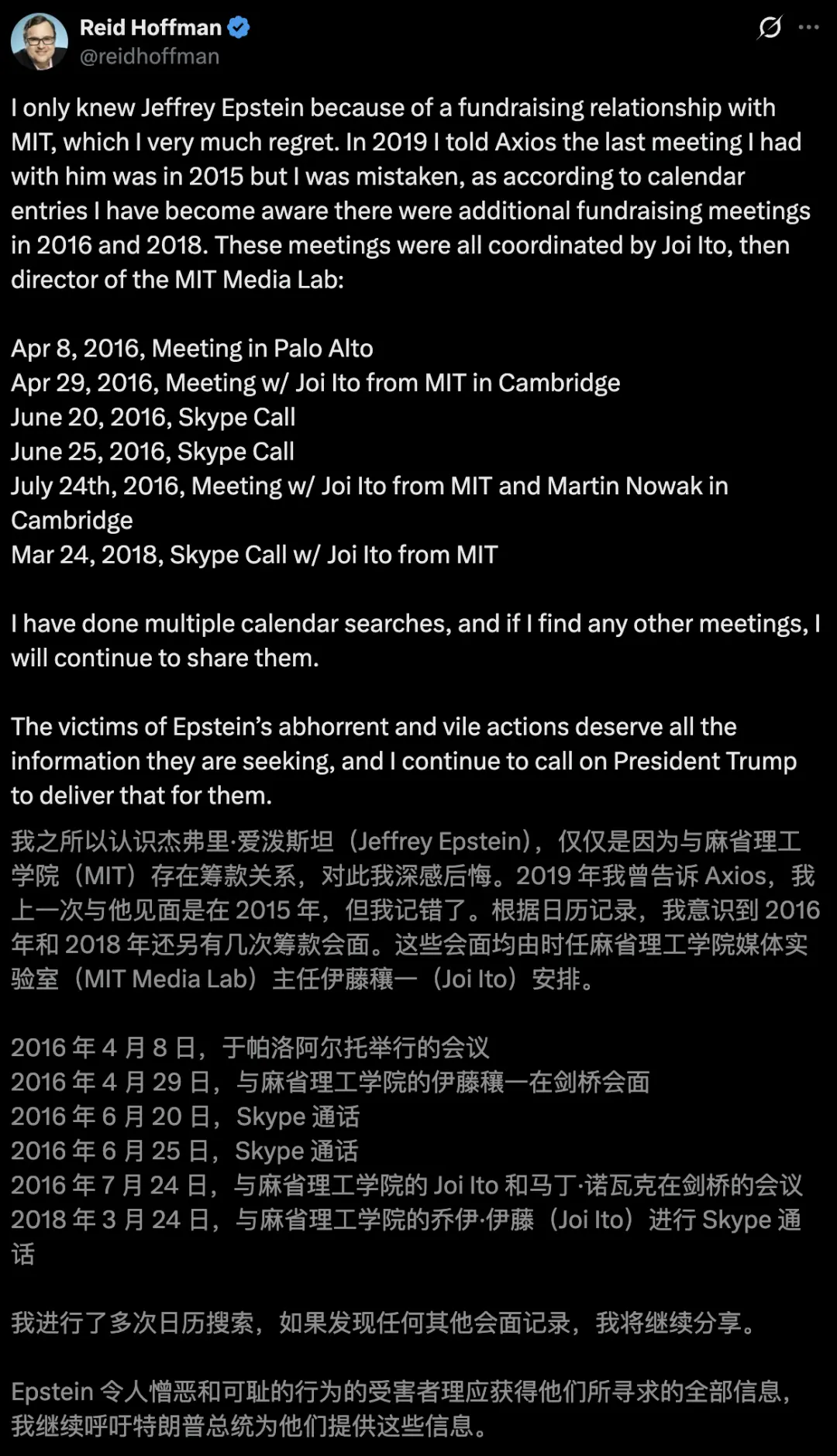 几天前,Hoffman曾公开“认错”,称参与爱泼斯坦的慈善筹款,是为了支持MIT媒体实验室。