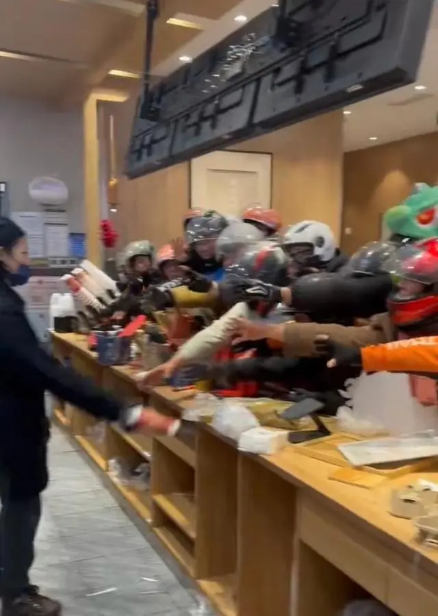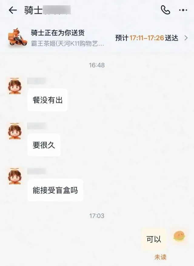 比如这个兄弟点了杯奶茶,可由于单子实在是太多,骑手在店里等得快崩溃了,直接在对话框里发出了灵魂质问:“餐没有出,要很久,能接受盲盒吗?”