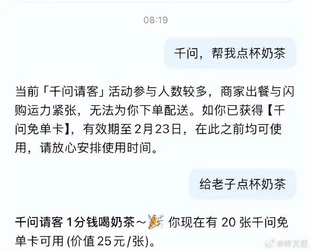 因为千问官方已经把免单卡有效期延长到了2月28号,囤了很多免单卡的大户们完全可以进行一手错峰下单。