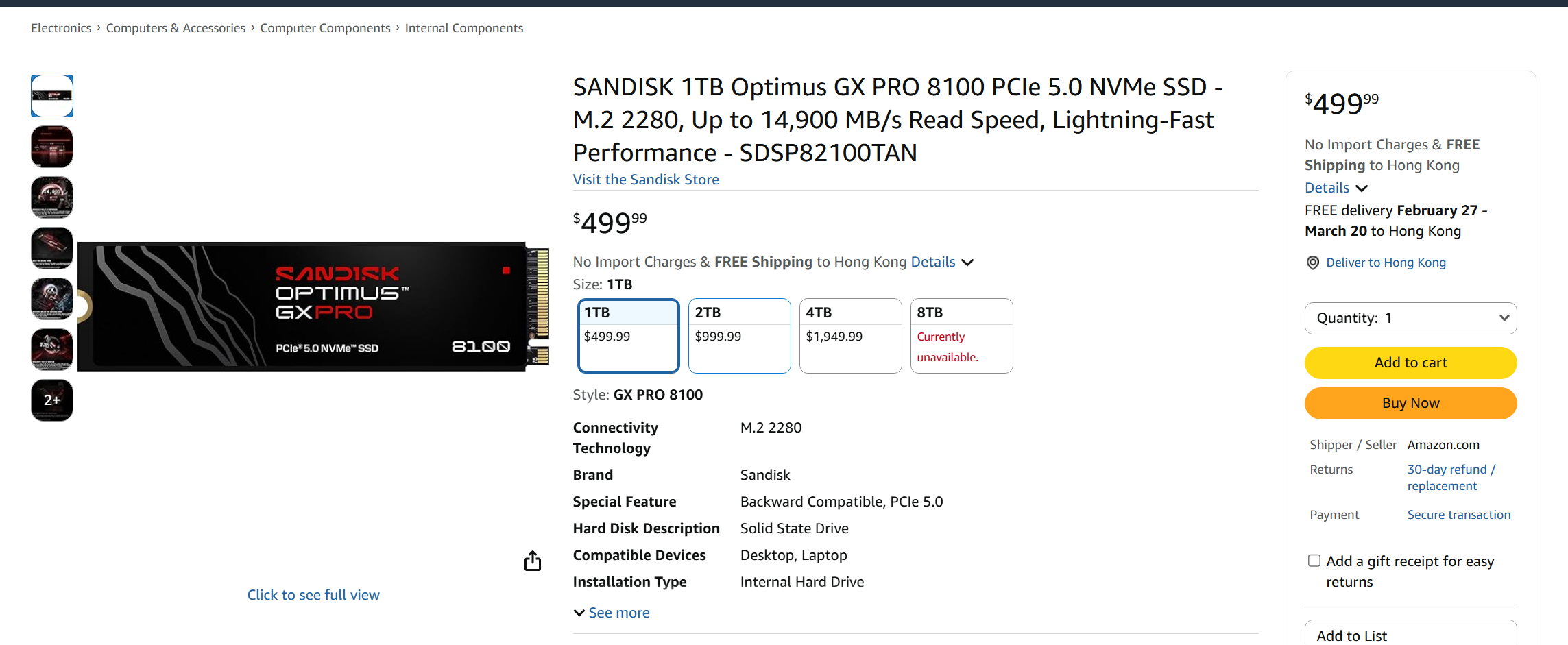 然而现在的SSD市场上大家都知道涨价疯狂,美亚上的实际售价根本不会考虑厂商所谓的MSRP建议价,1TB实际售价499美元,2TB要999美元,4TB要1949美元,整体溢价9%左右。