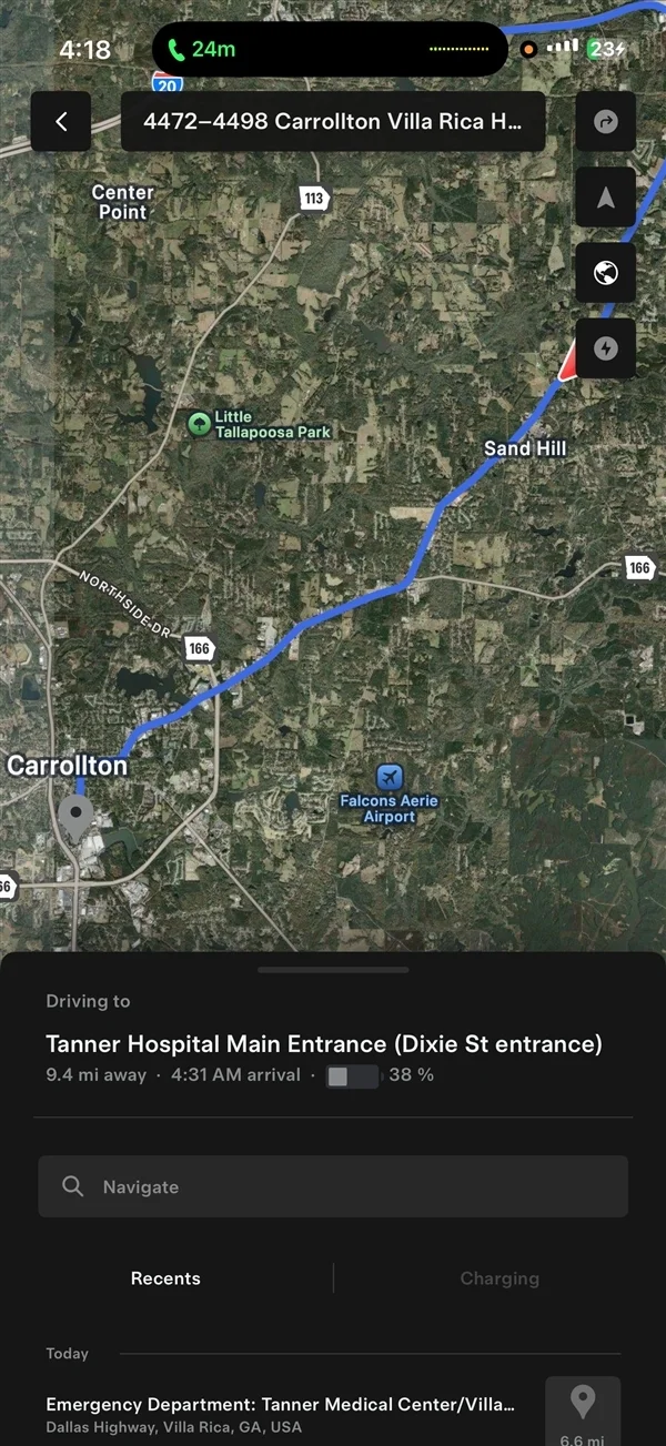 Jack作为授权驾驶员,通过特斯拉App远程更改父亲驾乘Model Y导航目的地,设为最近的Tanner Medical Center急诊室。