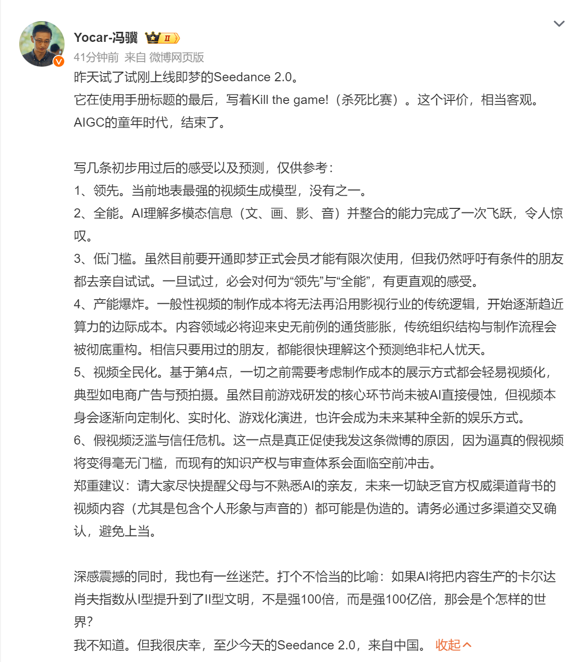 近日,一款名为Seedance2.0的AI视频生成模型再度刷屏国内外互联网。今日,《黑神话·悟空》制作人、游戏科学CEO冯骥发长文谈Seedance2.0。他对Seedance2.0评价称:“AI理解多模态信息并整合的能力完成了一次飞跃,令人惊叹。”