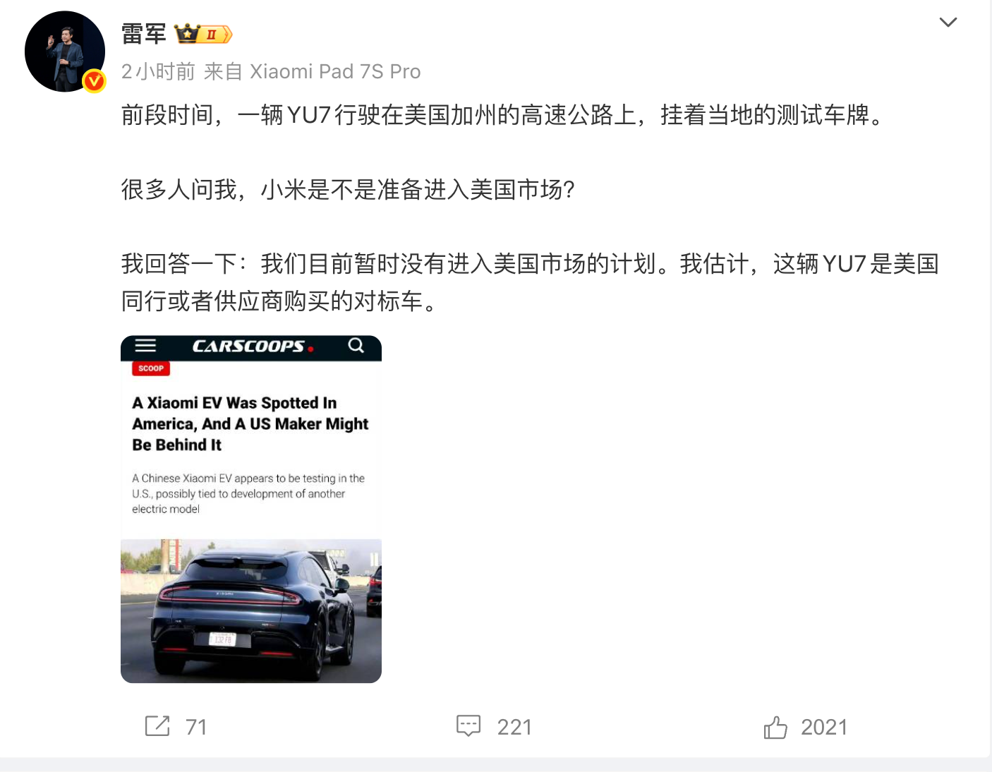 2月10日,雷军在微博发文表示,“前段时间,一辆YU7行驶在美国加州的高速公路上,挂着当地的测试车牌。很多人问我,小米是不是准备进入美国市场?我回答一下:我们目前暂时没有进入美国市场的计划。我估计,这辆YU7是美国同行或者供应商购买的对标车。”