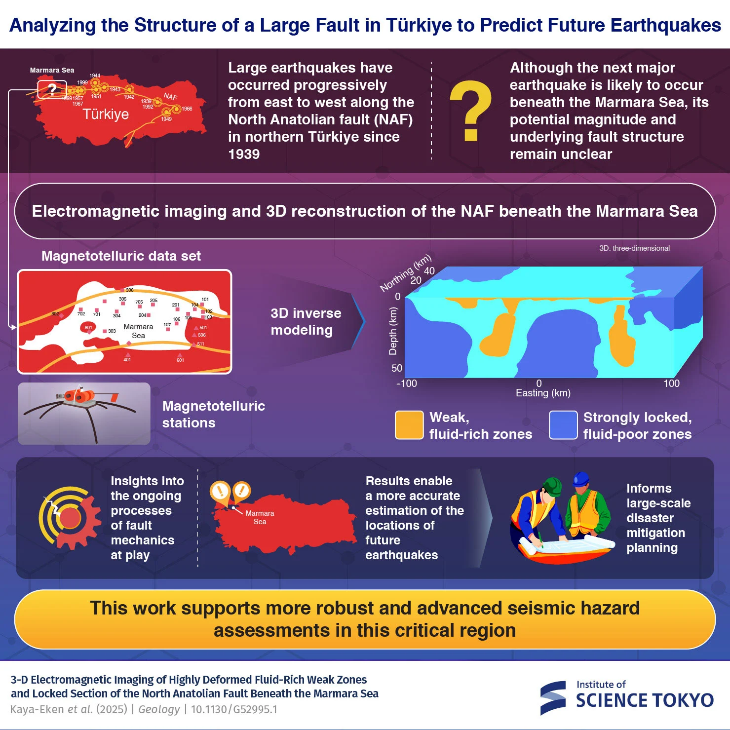 为填补这一空白,日本东京科学大学(Science Tokyo)综合研究所多元韧性研究中心的名誉教授小川康雄(Yasuo Ogawa)领衔,与土耳其博阿齐奇大学助理教授图莱·卡亚‑埃肯(Tülay Kaya‑Eken)等合作,对马尔马拉海下方区域展开了系统调查。相关成果近日发表在期刊《Geology》上,研究团队构建了首个覆盖这一关键区域的三维电磁结构模型,为理解断层内部物性差异与地震孕育之间的关系提供了全新视角。