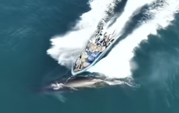 多位观鲸游客拍下视频,显示鲸鱼正在浮出水面换气(已喷水2-3次),周围多艘观鲸船均怠速或熄火,保持安全距离,而涉事渔船未减速、未避让,径直从鲸背上碾过,现场游客惊呼一片。