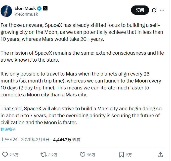 在上周末的社交媒体帖子中,马斯克曾解释称,每隔26个月才有一次前往火星的发射窗口,单程就要花6个月。但每隔10天就能向月球发射一次,两天就能到,因此迭代完成月球城市建设的速度要比火星城市快得多。