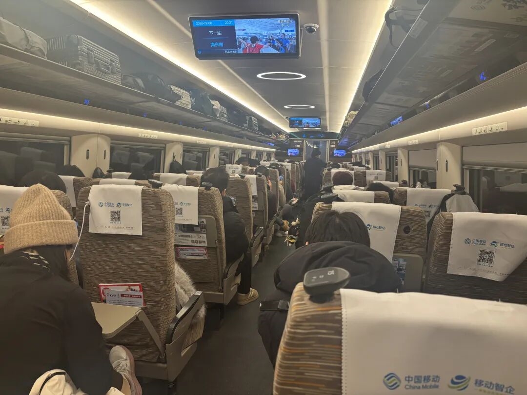 为了保证测试强度,我们专门挑了经典的牛马高铁线,从杭州到北京的高铁只需 4 个多小时,主打一个座无虚席,商务出差的“ 牛马 ”浓度极高,大家可以看到,车上的乘客确实拉满了。